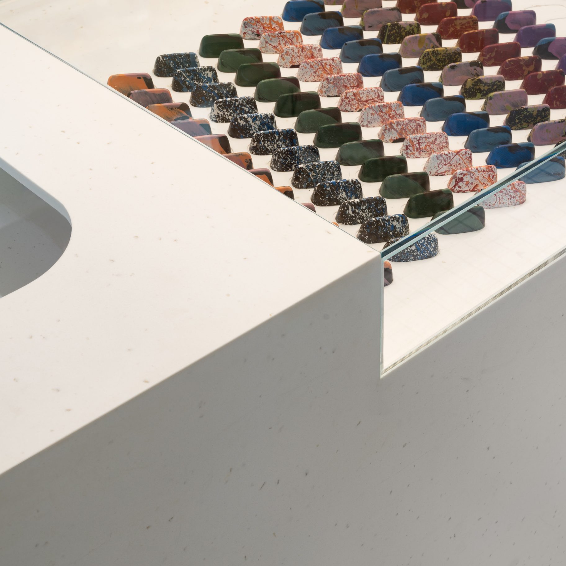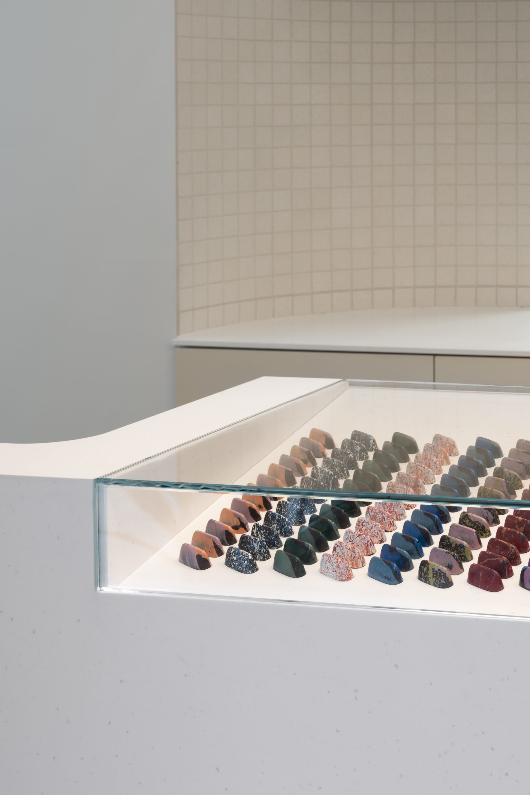 Dans cette quête de perfection, le parti architectural adopté se veut à l’image de leur artisanat : sobre, élégant et sans superflu. L’objectif étant de mettre en lumière les trésors comestibles qui émanent de leurs mains expertes. Ainsi, la palette de couleurs, douces et épurées, se marie harmonieusement avec les matériaux choisis avec soin : la mosaïque de porcelaine picotée noire évoquant la douceur de la chantilly à la vanille, les comptoirs en surface solide facilitant l’entretien, et l’acier galvanisé apportant une touche industrielle subtile.